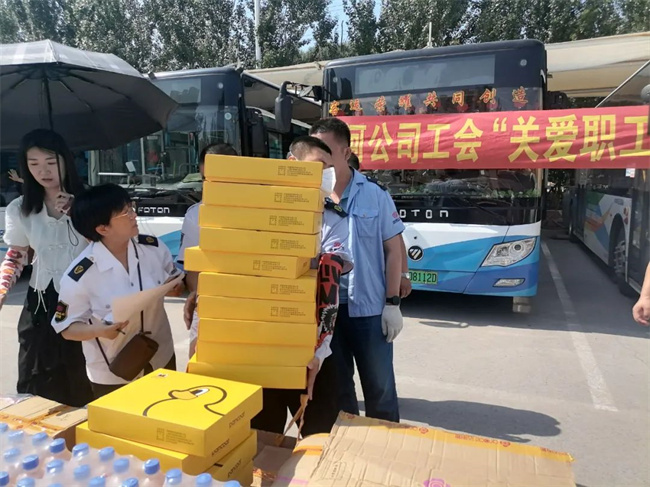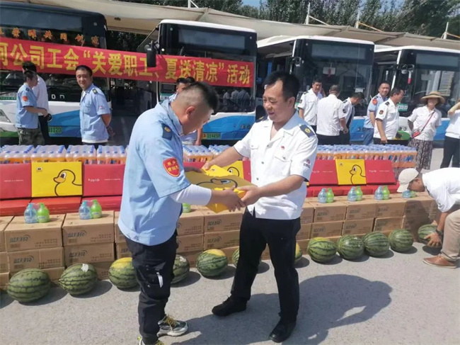 7月26日是二伏的第一天,酷暑難當。黃河公司由工會牽頭、領導班子帶隊,在西江街公交樞紐站開展了“關愛職工、夏送清涼”活動?;顒又校绢I導班子將購置的飲料、礦泉水、浴巾、毛巾、西瓜、洗手液等防暑降溫及清潔物品,分發(fā)給公司公司所屬14個車隊的22條線路、及機關、車間。