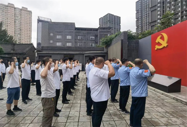 參觀后,在中共滿洲省委舊址宣誓廣場,全體黨員面對黨旗,舉起緊握的右手,重溫入黨誓詞。