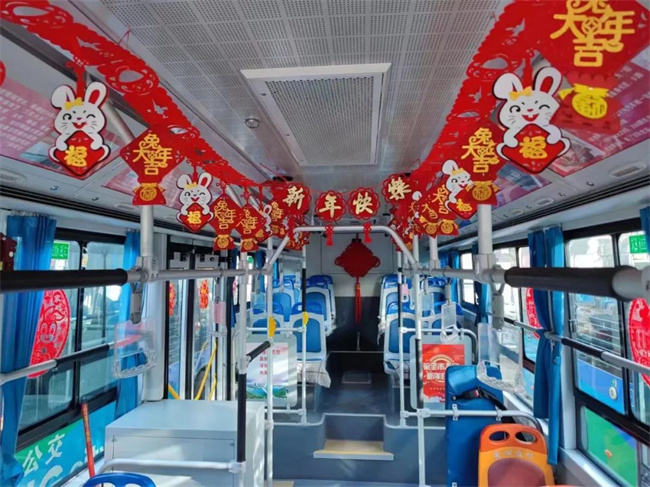 在209路車隊,車廂、站務(wù)室、辦公區(qū)域處處洋溢著喜慶的中國風(fēng),生肖窗花張貼在車窗兩側(cè),可愛的卡通兔“微笑”著向乘客們送著“祝?!保靶履昕鞓贰钡睦ㄕ咽局腥A民族的傳統(tǒng)佳節(jié)即將到來。