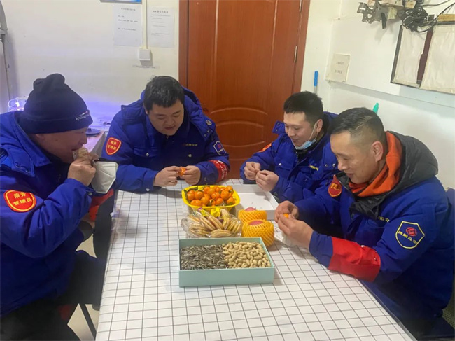 為了歡度春節(jié),車隊為駕駛員準(zhǔn)備了蘋果、桔子、花生、瓜子,還有熱氣騰騰的餃子。節(jié)日期間,大家歡聚在一起,臉上露出歡樂的笑容,駕駛員們吃著餃子,美在心,沉浸在團(tuán)圓的氛圍中。