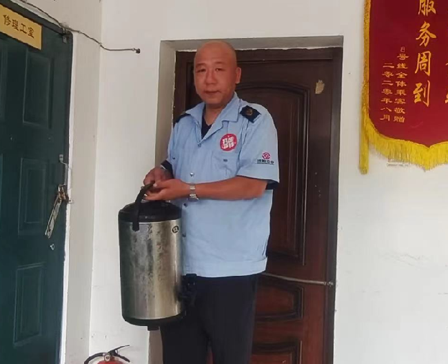 215路駕駛員尚麒麟看到同事們個個大汗淋漓、暑熱難耐,便從家里帶來了冷飲壺,在每天下班時將各種消暑飲品放在冰柜里冷凍,第二天早早來到車隊,把準(zhǔn)備好的冷飲放進冷飲壺,供車隊的兄弟姐妹們消暑飲用。