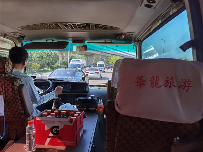 比賽開始后,為保障參賽選手的安全,華龍公司5臺中巴車輛又化身“賽道收容車”,緊跟在組委會領(lǐng)頭車輛身后,沿著參賽選手的比賽路線,一路伴隨著參賽選手行駛,為比賽途中發(fā)生意外及體力不支的運(yùn)動員提供幫助。
