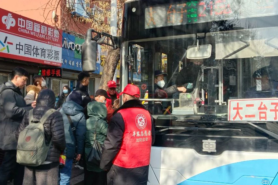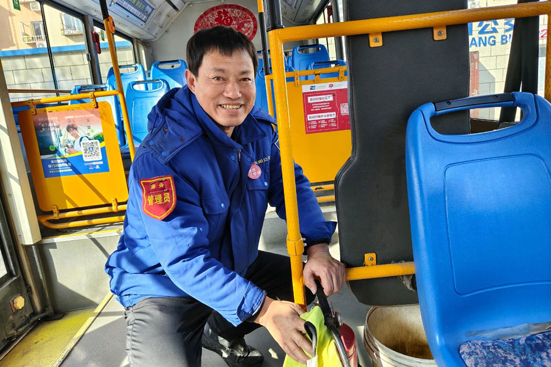 在219路大二臺子公交站臺,一位拄拐老人正在志愿者的攙扶下平穩(wěn)登車;寒風中,身穿紅馬甲的工作人員細心擦拭著候車長椅;車廂里,...