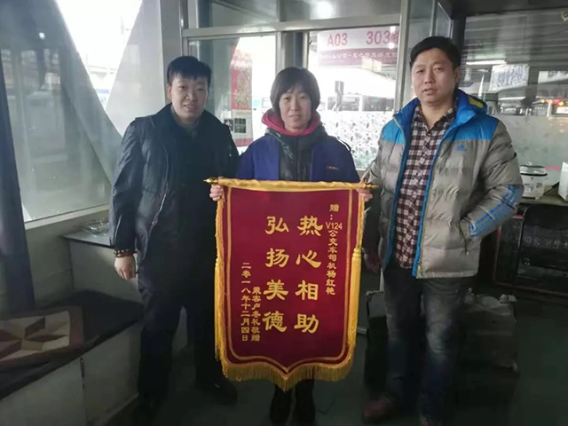 次日,盧女士懷著激動(dòng)的心情,手里捧著錦旗來(lái)到龍之夢(mèng)終點(diǎn)站,親自將錦旗交給了楊紅艷手中并合影留念。